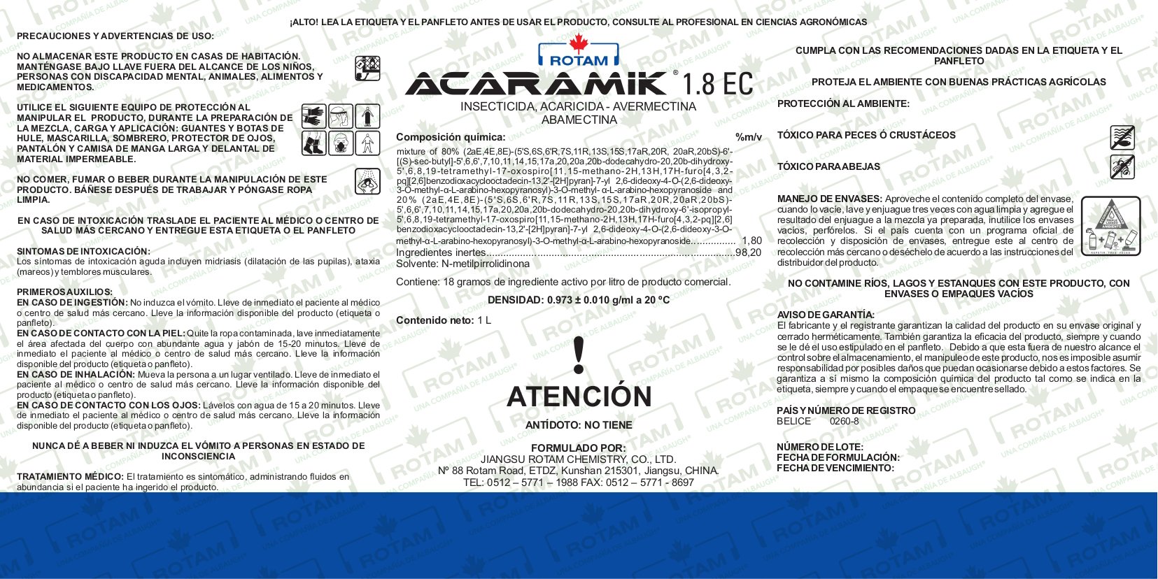Mode of Action: It is an acaricide-insecticide of natural origin produced by fermentation by the soil bacterium Streptomyces avermitilis. It controls sucking, scraping, and miner pests and stimulates the release of Gamma-Aminobutyric acid (GABA), inhibiting neuromuscular transmission, which causes paralysis and death. ACARAMIK® 1.8 EC is translaminar and acts on pests by contact and ingestion. It presents residual activity by remaining within the tissue while the outer portion is degraded by environmental factors, which contributes to its selectivity to benefits.