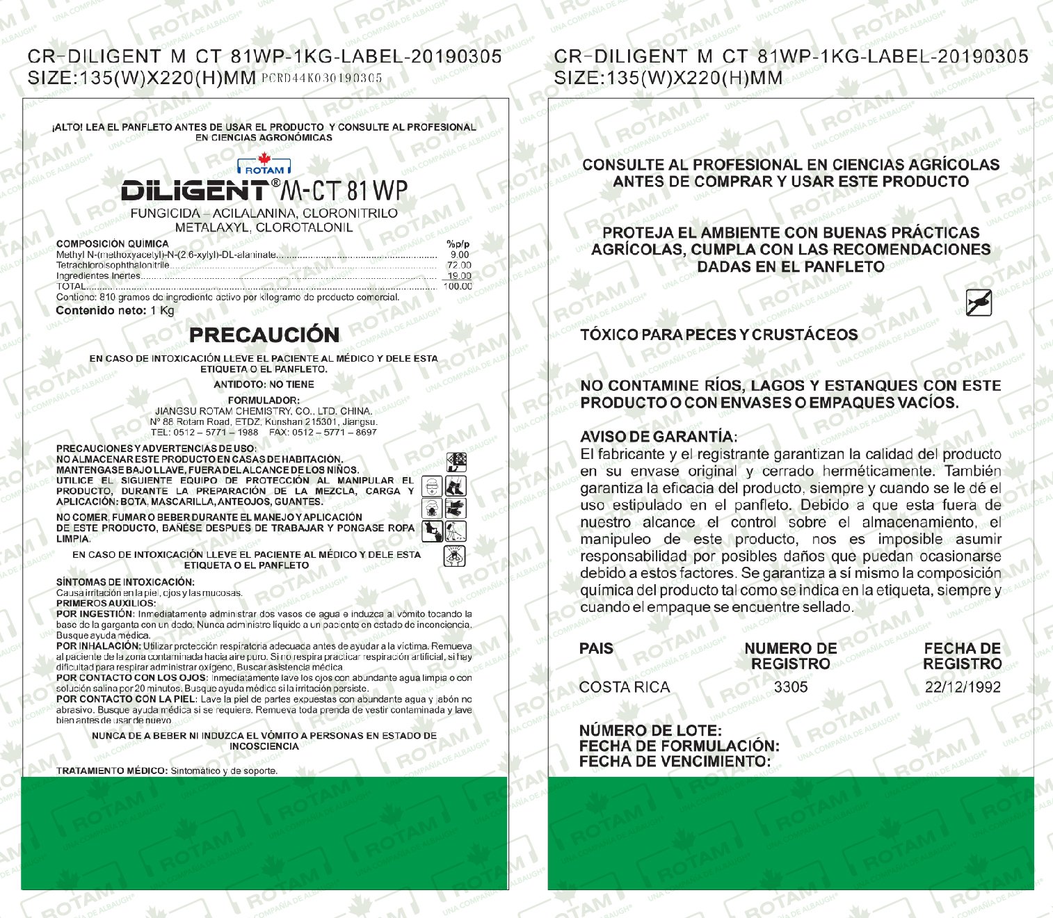 DILIGENTE M CT 81 WP is a dual-active fungicide based on metalaxyl and chlorothalonil, which combines the systemic control generated by metalaxyl and the protective action of Chlorothalonil.