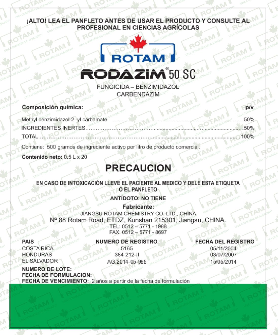 - RODAZIM 50 SC is a fungicide based on carbendazim, systemic and therefore curative of the group of benzimidazoles. It acts by inhibiting the polymerization of tubulin, a protein essential for cell division in a wide range of phytopathogenic fungi. In foliar application it behaves as a translaminar fungicide.
