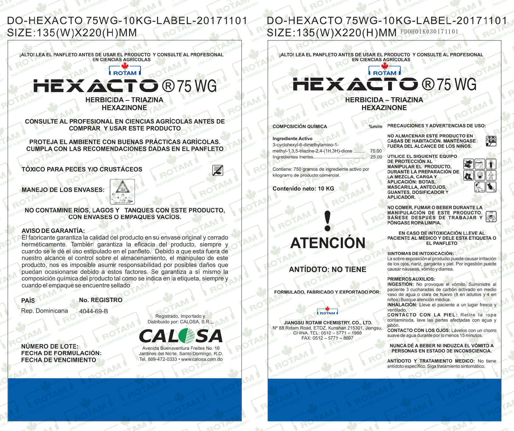 HEXACTA® 75 WG belongs to the family of triazines, herbicides that inhibit electron transport in photosystem II of photosynthesis (Group C1 HRAC). It can be absorbed by the leaves, but its main route of absorption is through the root system, when applied to the soil it is absorbed by the roots and is translocated via xylem (acrópetala action) to the foliage where it blocks the photosynthetic action. When applied to foliage it behaves translaminar. Susceptible weeds first present chlorosis and then, with the passage of days, present necrosis (burning) of the leaves.