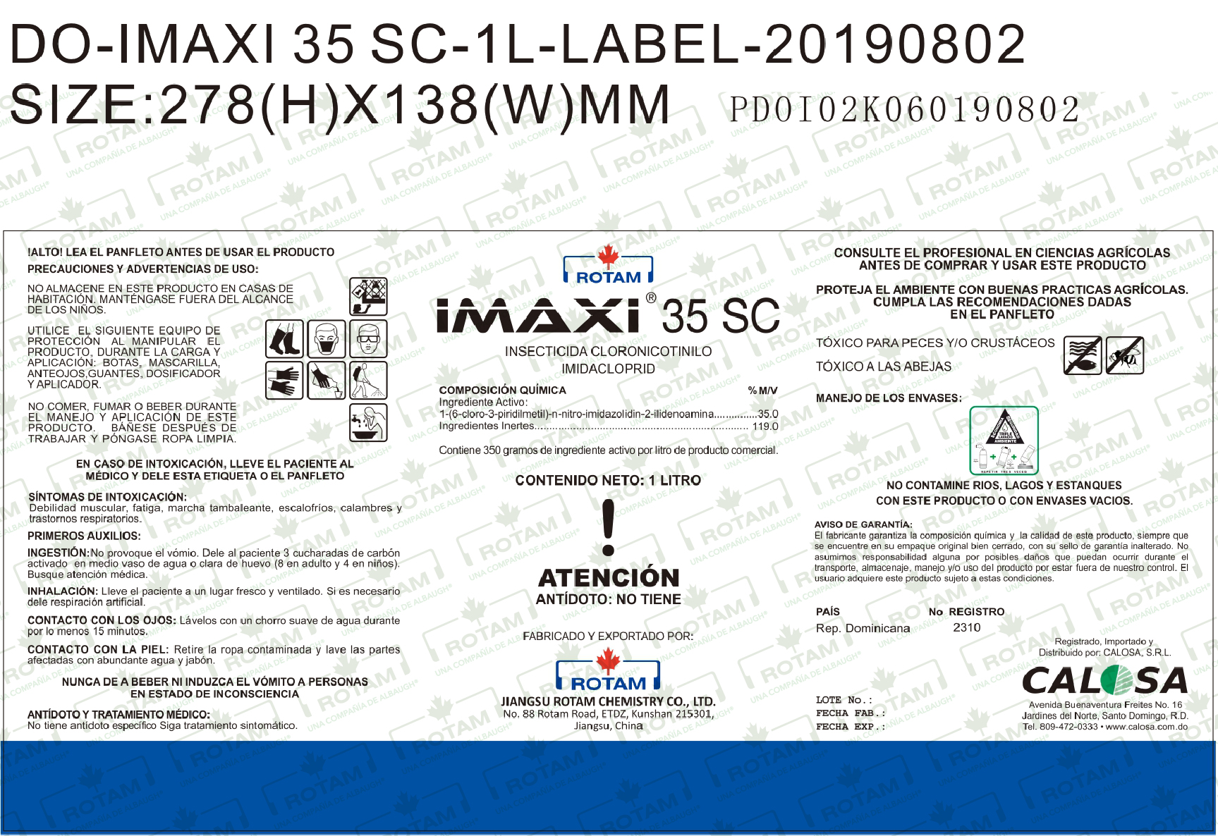 IMAXI 35 SC Imidacloprid is a translaminar systemic insecticide with stomach and contact action. Plants take imidacloprid easily by the roots distributing it acropétalamente. Imidacloprid controls pest and soil insects, suckings, chewers, leafhoppers and termites in agricultural, grass and ornamental crops. Imidacloprid does not control nematodes or mites. It is used as a seed, soil and foliar treatment in crops such as rice, cotton, cereals, corn, beets, potatoes, vegetables, citrus and fruit trees.