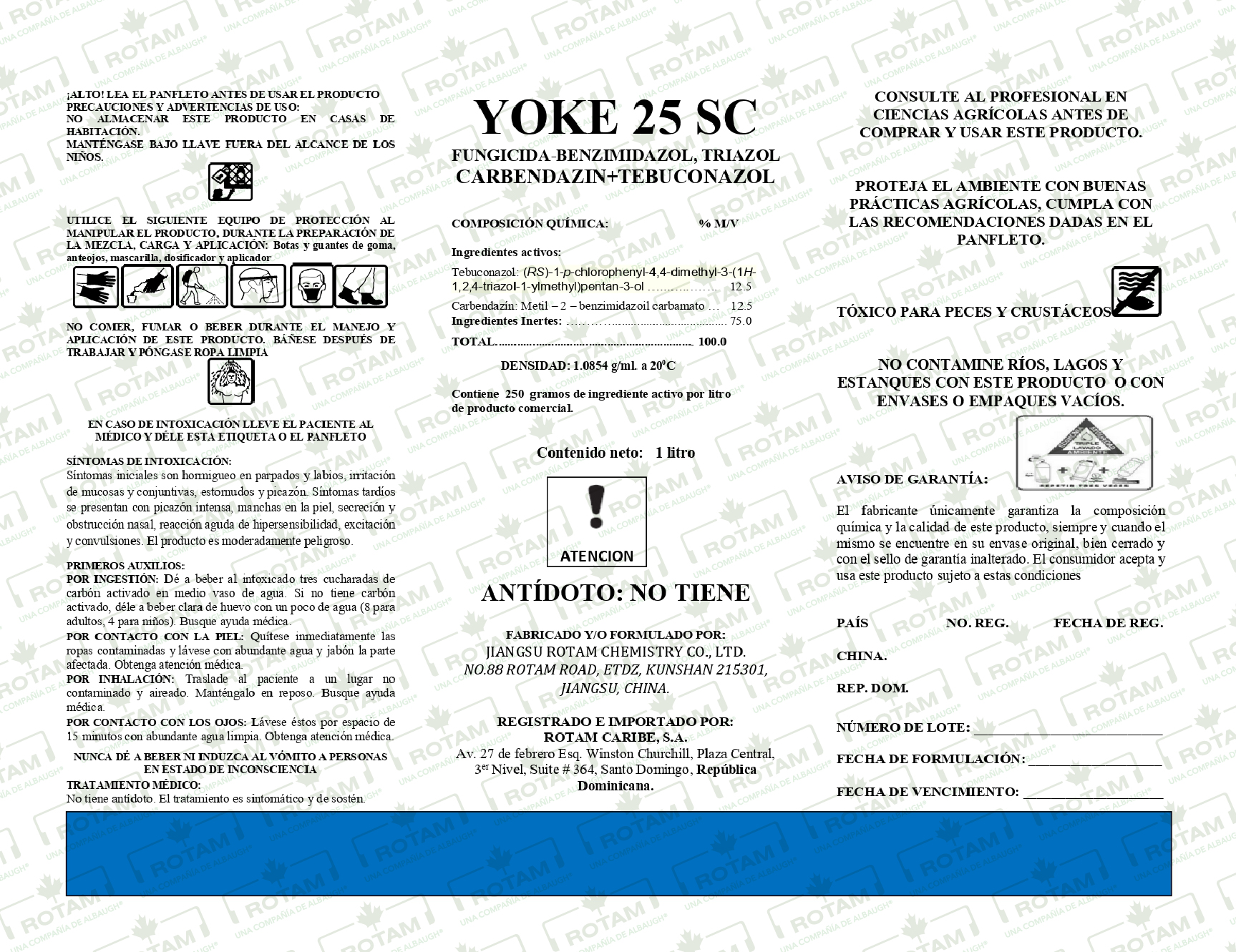 - YOKE 25 SC es un Funguicida compuesto por Tebuzonazole y Carbendazina con doble mecanismo de acción para el control de una amplia gama de enfermedades causadas por hongos fitopatógenos en cultivos como arroz, maní, vegetales.