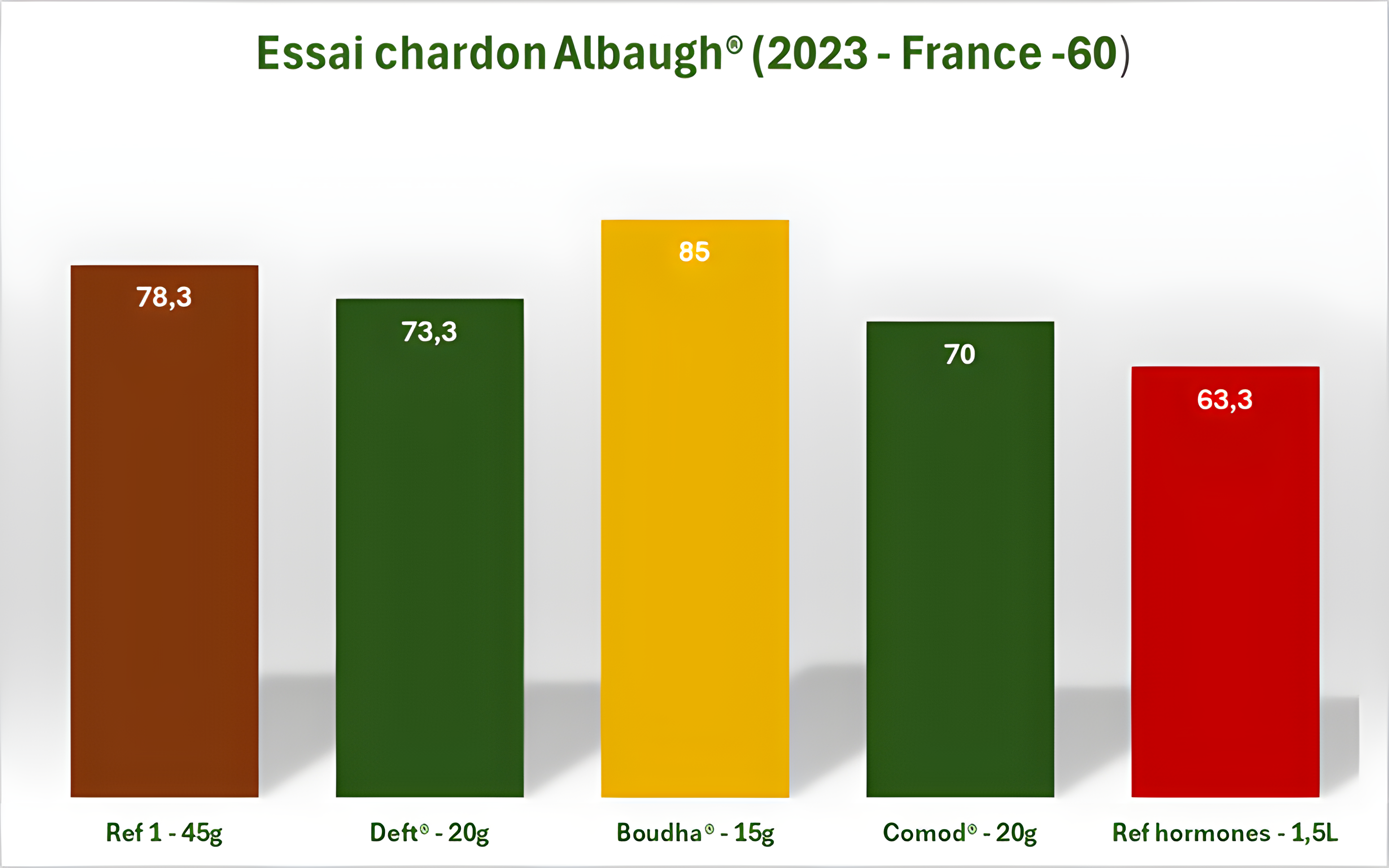 - Boudha®, Blusky®, Gaulois® : Association de Metsulfuron et Tribénuron-méthyle, Cette solution offre une souplesse de positionnement en alliant 2 matières actives larges spectre et efficaces contre le chardon