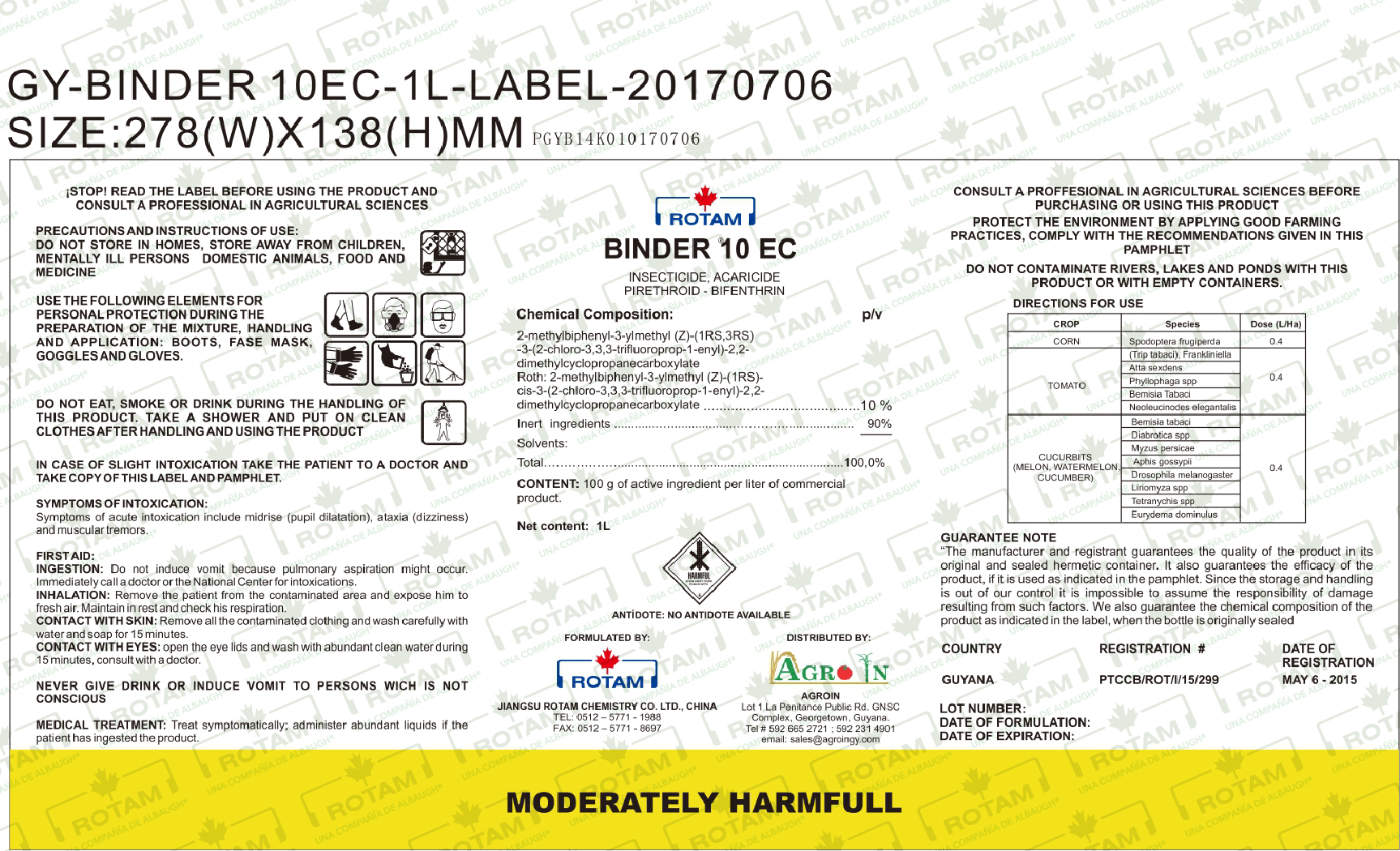 Mode of Action: BINDER 10 EC acts by direct contact and by ingestion by being absorbed through the cuticle and by inhalation in insects, and it is not systemic in plants. It has a broad spectrum of control in early and adult stages of many species of coleopteran insects.