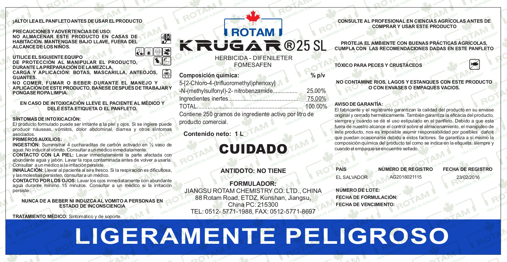KRUGAR® 25 SL is a contact herbicide, selective for beans and soybeans, for the control of broadleaf weeds in early post-emergence (1 to 4 leaves). It acts on the leaves, inhibiting the enzyme protoporphyrinogen oxidase (PPO, PROTOX), causing desiccation and necrosis of the foliage. It is recommended to apply in the early hours of the morning so that the product enters the leaves of the weed, is redistributed within them, and then, when the light increases, it exerts its herbicidal effect.