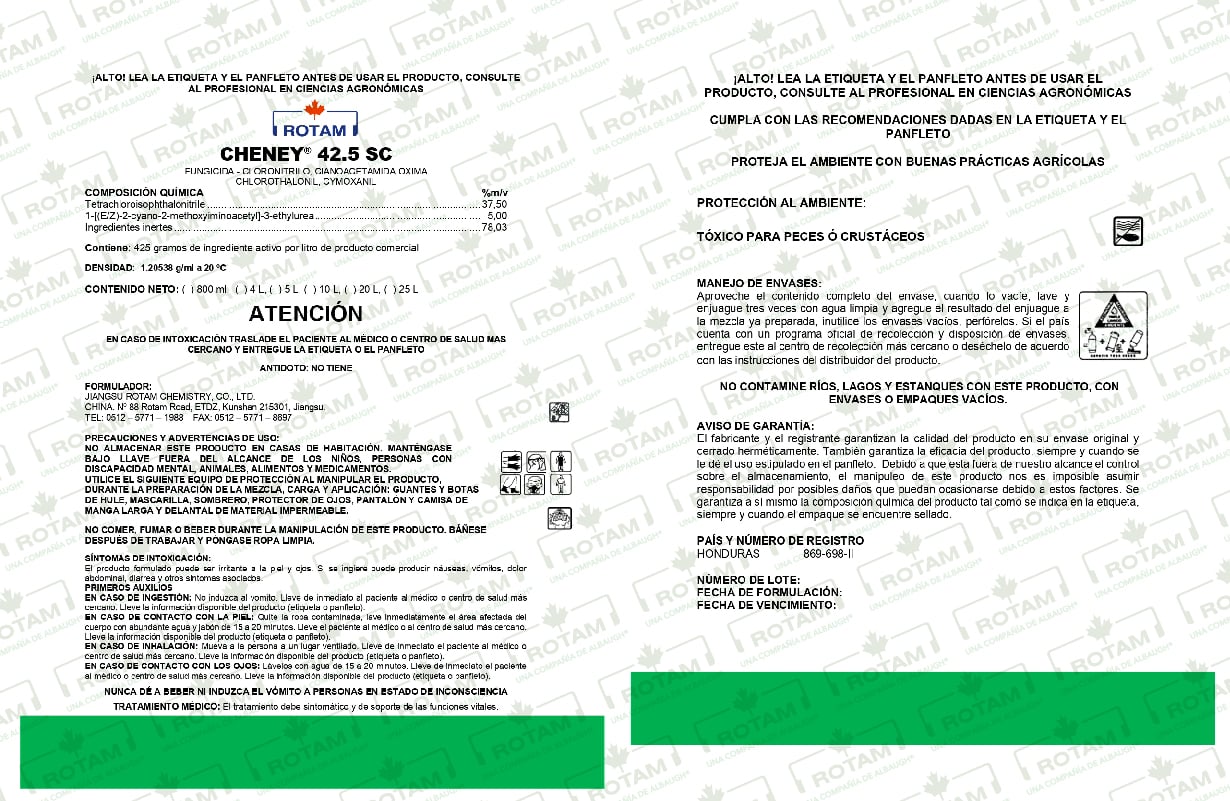 CHENEY® 42,5 SC es un fungicida que combina el poder de protector de clorotalonil con la acción sistémica del cymoxanil. Clorotalonil es un funguicida, protectante, el cual actúa inhibiendo el proceso de germinación y desarrollo de los hongos. Cymoxanil es fungicida sistémico translaminar y función acropetal con acción multisitio sobre los cuatro procesos metabólicos: respiración, biosísntesis de aminoácidos, metabolismo de la Uridina y permeabilidad de las membranas de los hongos Oomycetos.