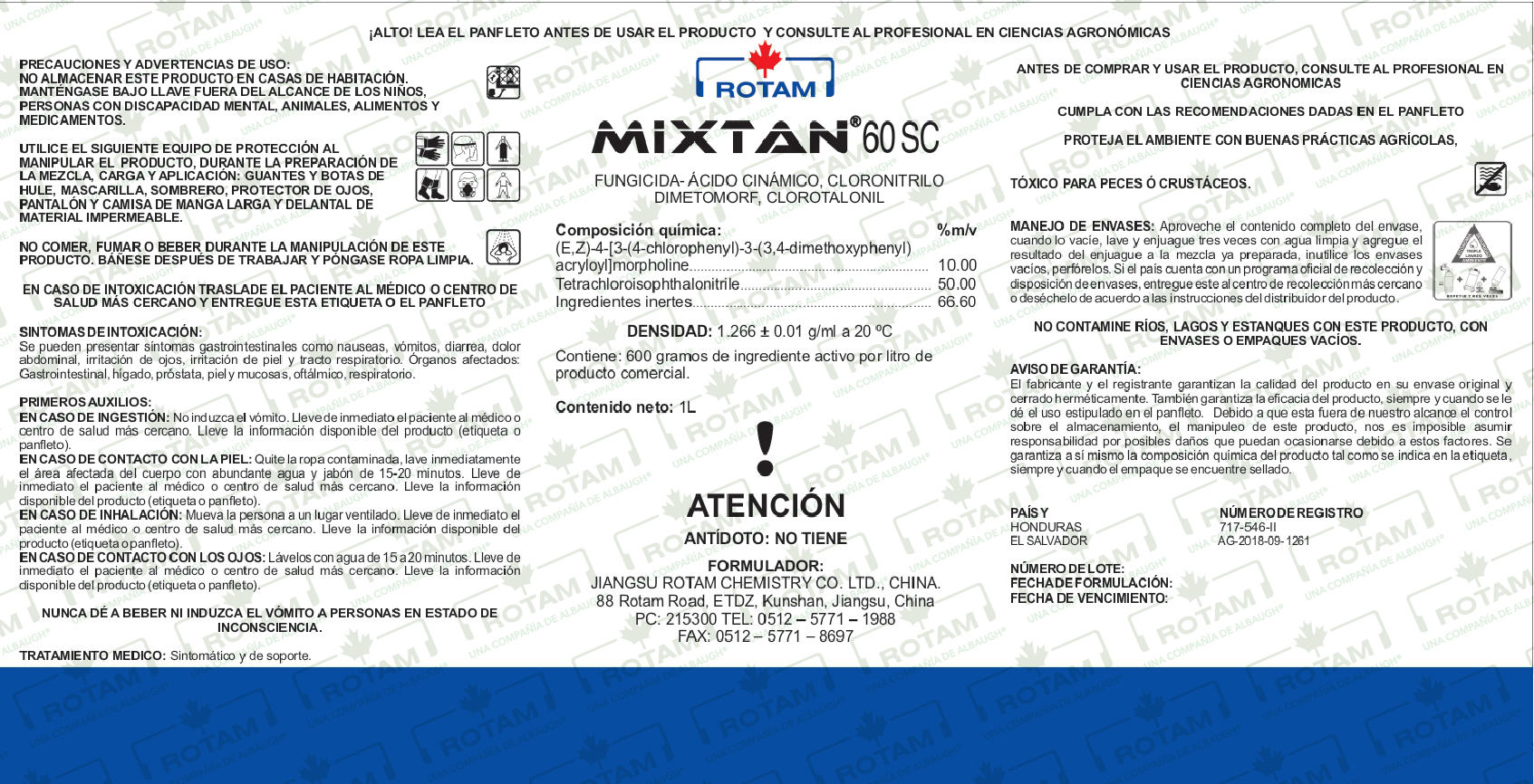 MIXTAN 60 SC es una mezcla de dos componentes contra hongos Oomicetes, posee acción protectante, antiesporulante, con lo cual reduce el potencial de reinfestación, con propiedades de sistemicidad local y translaminar.