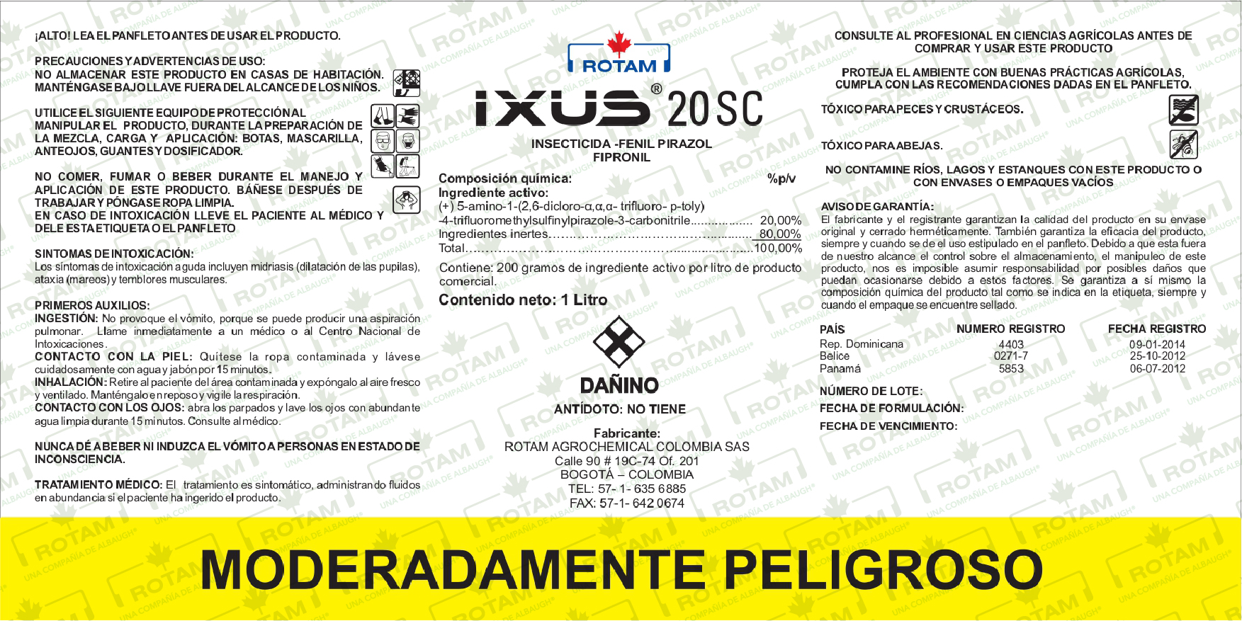 El fipronil del IXUS 20 SC es un excelente insecticida de amplio espectro de control con más de 250 especies de plagas en 60 cultivos registrados en el año 2000 en USA. Controla lepidópteros, ortópteros, thysanopteros (Trips) y larvas de coleópteos plagas de suelo, así como pulgas, garrapatas, termitas, hormigas y cucarachas en prados.