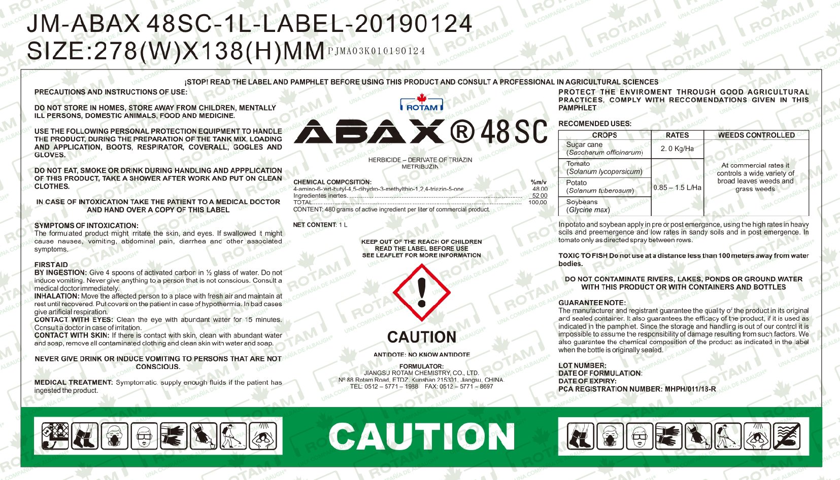 Modo de acción: ABAX® 48 SC es absorbido por la raíz y por el tejido pulverizado, y se transloca a los tejidos superiores de las malas hierbas, donde actúa inhibiendo el proceso de fotosíntesis. Se utiliza para el control de pasto y malezas de hoja ancha en cultivos como soja, papas, caña de azúcar, tomates y hortalizas.