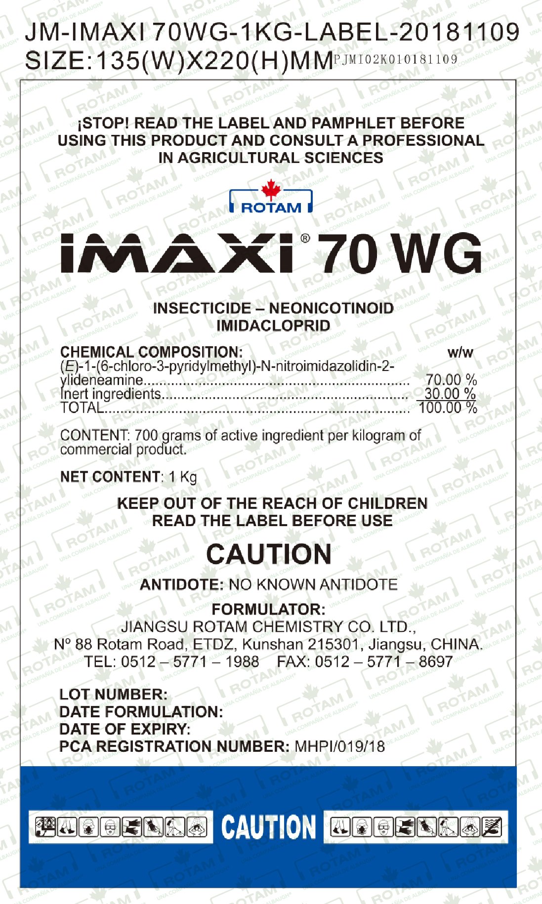 Mode of Action: IMAXI® 70 WG systemic translaminar insecticide with stomach and contact action. Plants absorb Imidacloprid easily through the roots, distributing it acropetally to control pest and soil insects in agricultural crops.