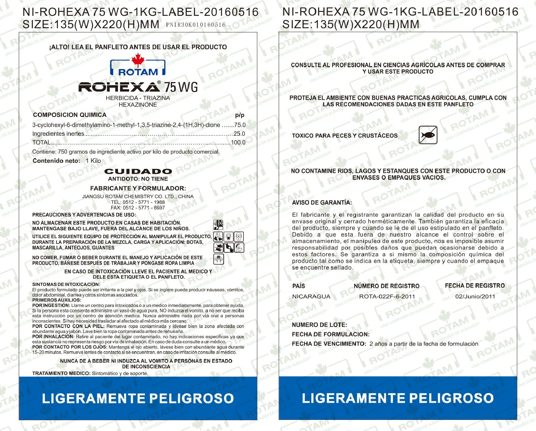 ROHEXA® 75 WG belongs to the family of triazines, herbicides that inhibit electron transport in photosystem II of photosynthesis. It can be absorbed by the leaves, but its main route of absorption is through the root system, when applied to the soil it is absorbed by the roots and is translocated via xylem (acrópetala action) to the foliage where it blocks the photosynthetic action. When applied to foliage it behaves translaminar.
