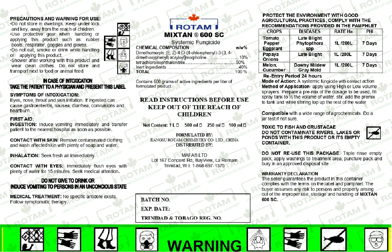 MIXTAN® 60 SC es un fungicida a base de Dimetomorf y Clorotalonil con acción protectora, antiesporulante, reduciendo el potencial de reinfestación, con propiedades sistémicas y translaminares locales.