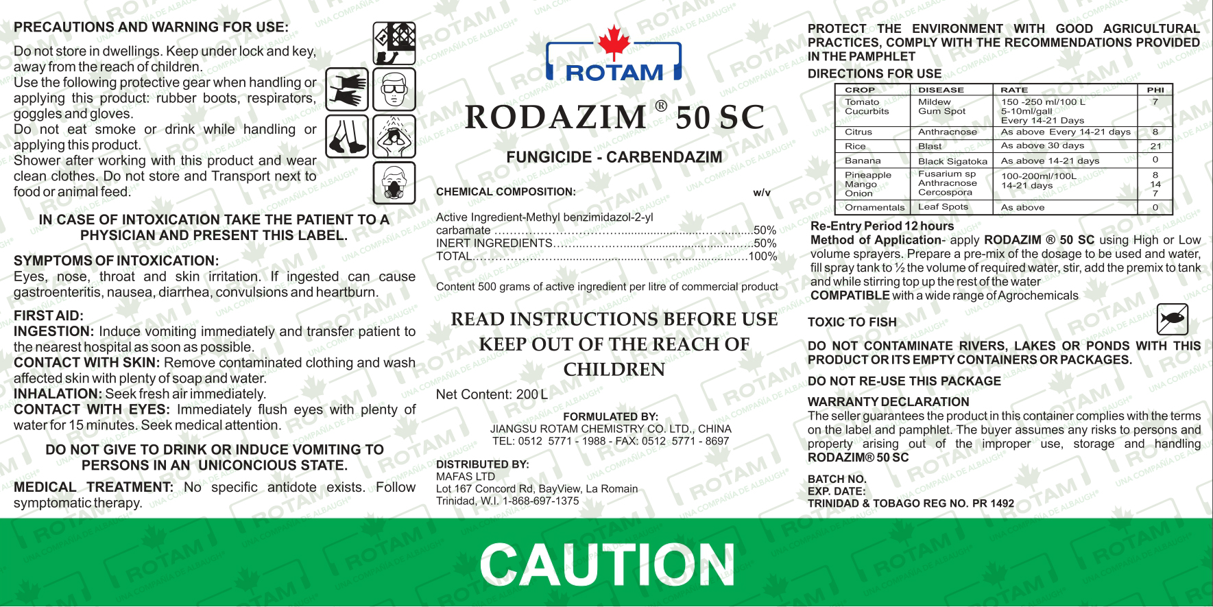 Mecanismo de acción: Fungicida sistémico con contacto y acción curativa, que se absorbe a través de las raíces y tejidos verdes y se transloca acropetamente. Rodazim® 50 SC inhibe el desarrollo de tubos germinales, la formación de appressoria y el crecimiento del micelio. Se utiliza en el control de patógenos como Fusarium, Colletotrichum y Rhizoctonia en frijoles y arroz.