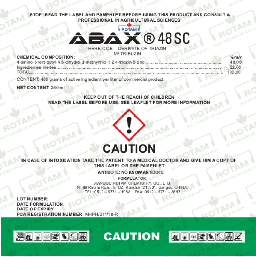 ABAX® 48 SC es un herbicida con Metribuzin de uso agrícola para el control pre y post emergencia de gramíneas y malezas de hoja ancha.