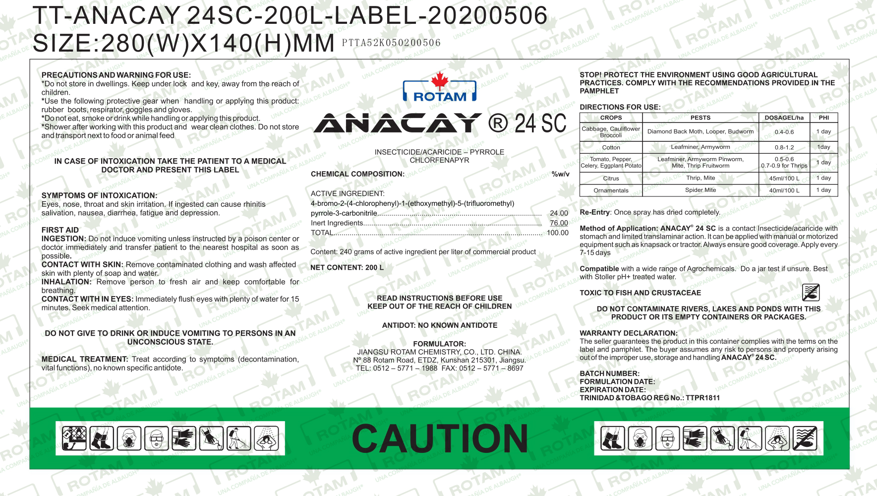 Modo de acción: ANACAY® 24 SC es un insecticida-acaricida no sistémico de la familia del pirrol que funciona por ingestión y por contacto y es especialmente eficaz en el control de los comedores de hojas.